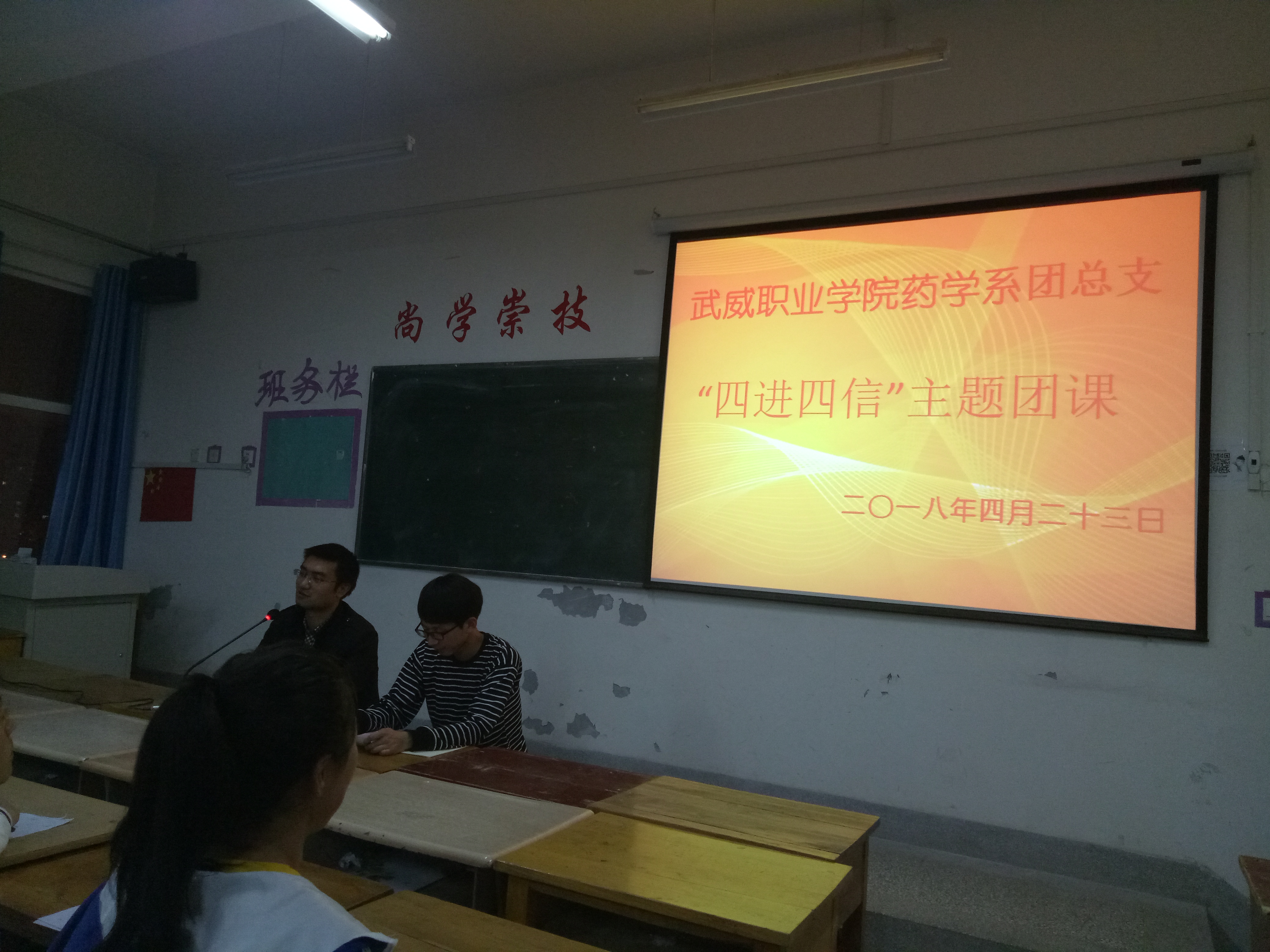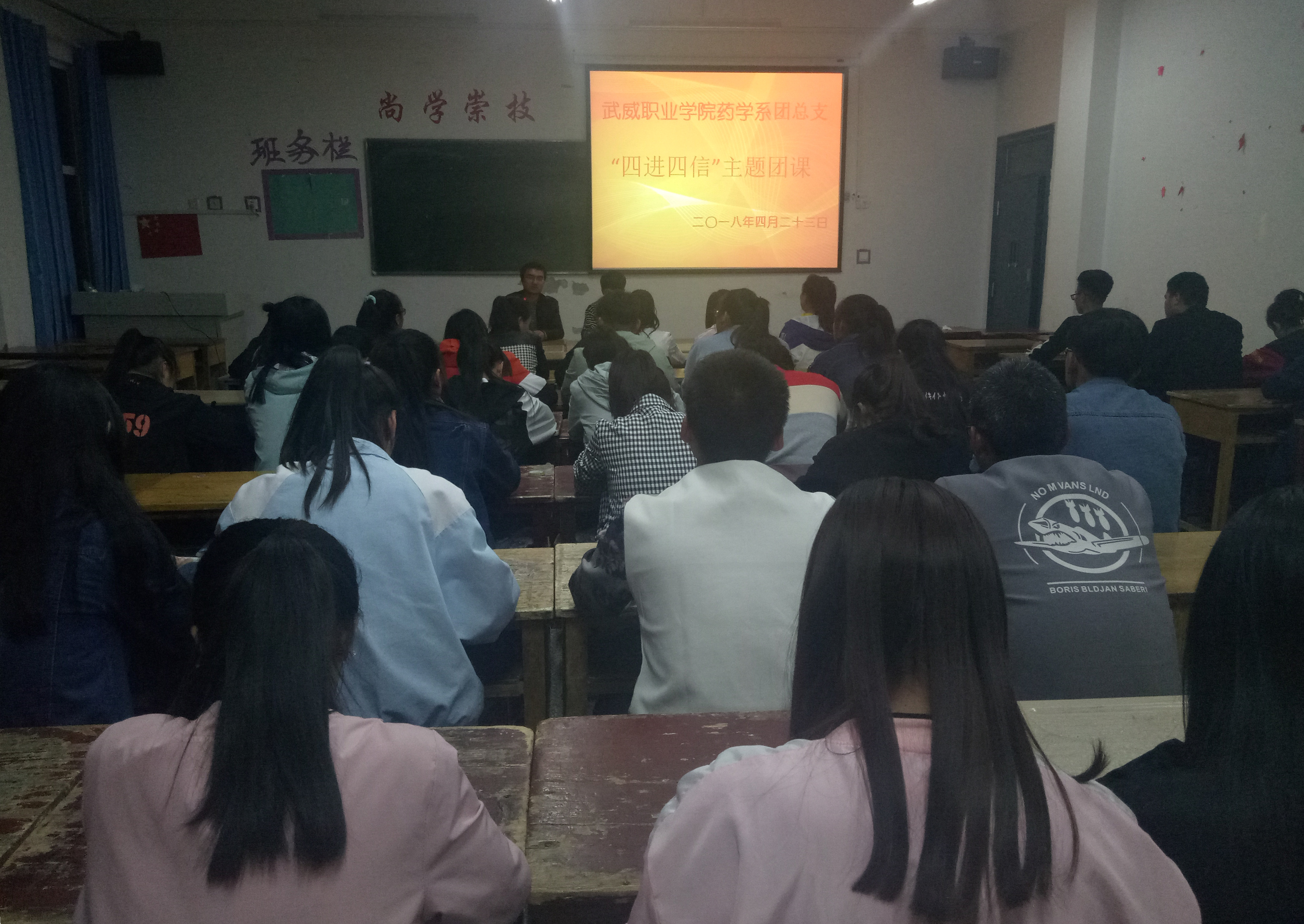為深入學(xué)習(xí)宣傳貫徹習(xí)近平新時(shí)代中國(guó)特色社會(huì)主義思想,堅(jiān)持以習(xí)近平新時(shí)代中國(guó)特色社會(huì)主義思想武裝團(tuán)員干部和團(tuán)員青年學(xué)生頭腦,積極推進(jìn)各項(xiàng)工作開展。2018年4月23日晚,藥學(xué)系團(tuán)總支組織16級(jí)團(tuán)員青年及17級(jí)入團(tuán)積極分子在明遠(yuǎn)樓501教室開展關(guān)于“四進(jìn)四信”的主題團(tuán)課活動(dòng),團(tuán)課由要藥學(xué)系團(tuán)總支書記陳輝生主持。