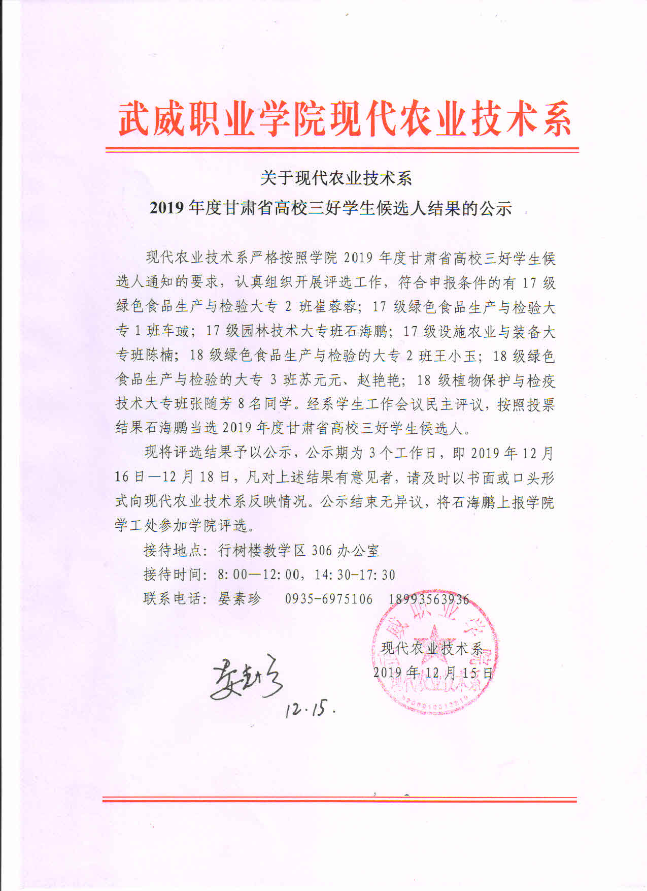 關于現(xiàn)代農業(yè)技術系2019年度甘肅省高校三好學生候選人結果的公示