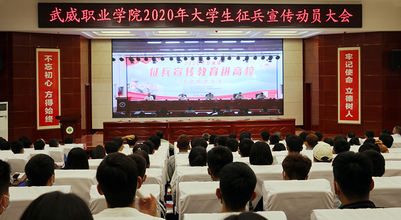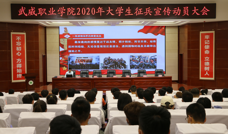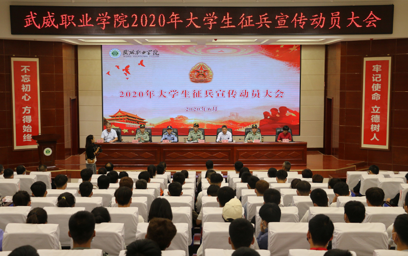 6月10日上午,學(xué)院2020年大學(xué)生征兵宣傳動(dòng)員大會(huì)在菁英廳舉行。武威軍分區(qū)司令員張國(guó)輝、武威軍分區(qū)動(dòng)員處處長(zhǎng)劉忠、涼州區(qū)人武部部長(zhǎng)闞延貴、涼州區(qū)人武部政委丁俊強(qiáng),學(xué)院黨委書記、院長(zhǎng)趙明,副院長(zhǎng)何毅出席會(huì)議。各院系負(fù)責(zé)人、輔導(dǎo)員和學(xué)生代表共200人參加了會(huì)議。會(huì)議由副院長(zhǎng)王守云主持。