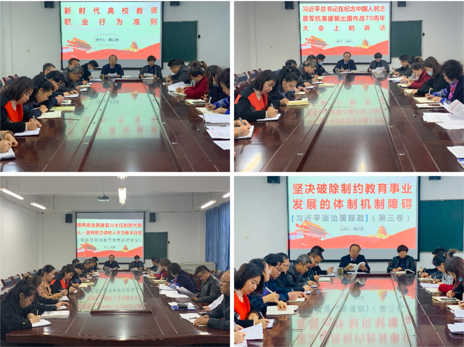 黃文源領(lǐng)學(xué)了《習(xí)近平談治國理政》(第三卷)第十二條 提高保障和改善民生水平——堅(jiān)決破除制約教育事業(yè)發(fā)展的體質(zhì)機(jī)制障礙,解讀了《新時(shí)代高校教師職業(yè)行為十項(xiàng)準(zhǔn)則》,要求所有教師要做以德立身、以德立學(xué)、以德施教、以德育德的楷模。楊如松領(lǐng)學(xué)了《習(xí)近平總書記教育重要論述講義》第二講 培養(yǎng)擔(dān)當(dāng)民族復(fù)興大任的時(shí)代新人——堅(jiān)持把立德樹人作為根本任務(wù)。楊建紅老師領(lǐng)學(xué)了習(xí)近平總書記在紀(jì)念中國 人民志愿軍抗美援朝出國作戰(zhàn)70周年大會(huì)的講話。
