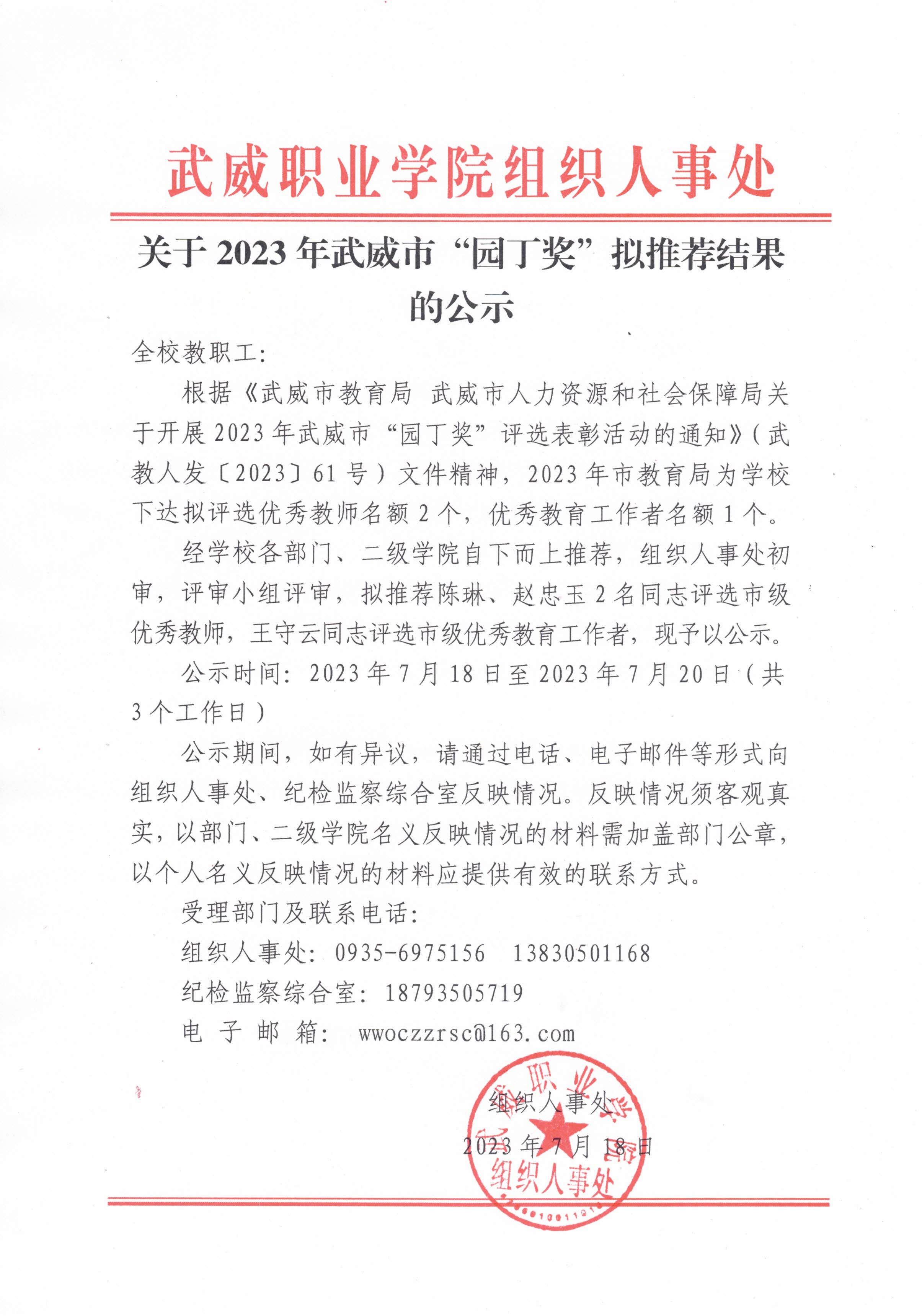 關于2023年武威市“園丁獎”擬推薦結果的公示