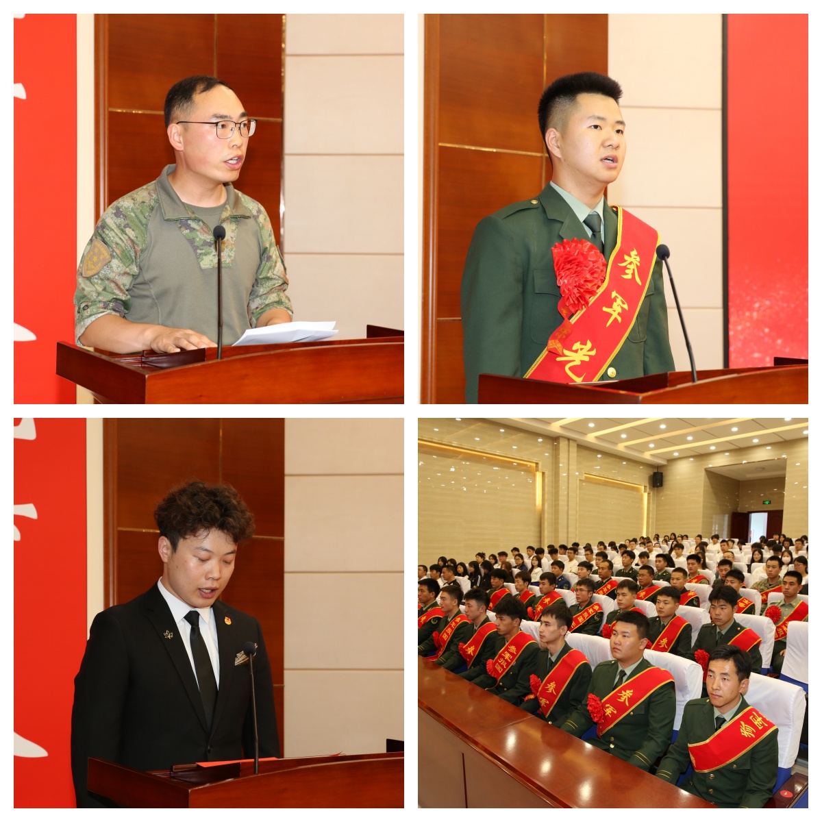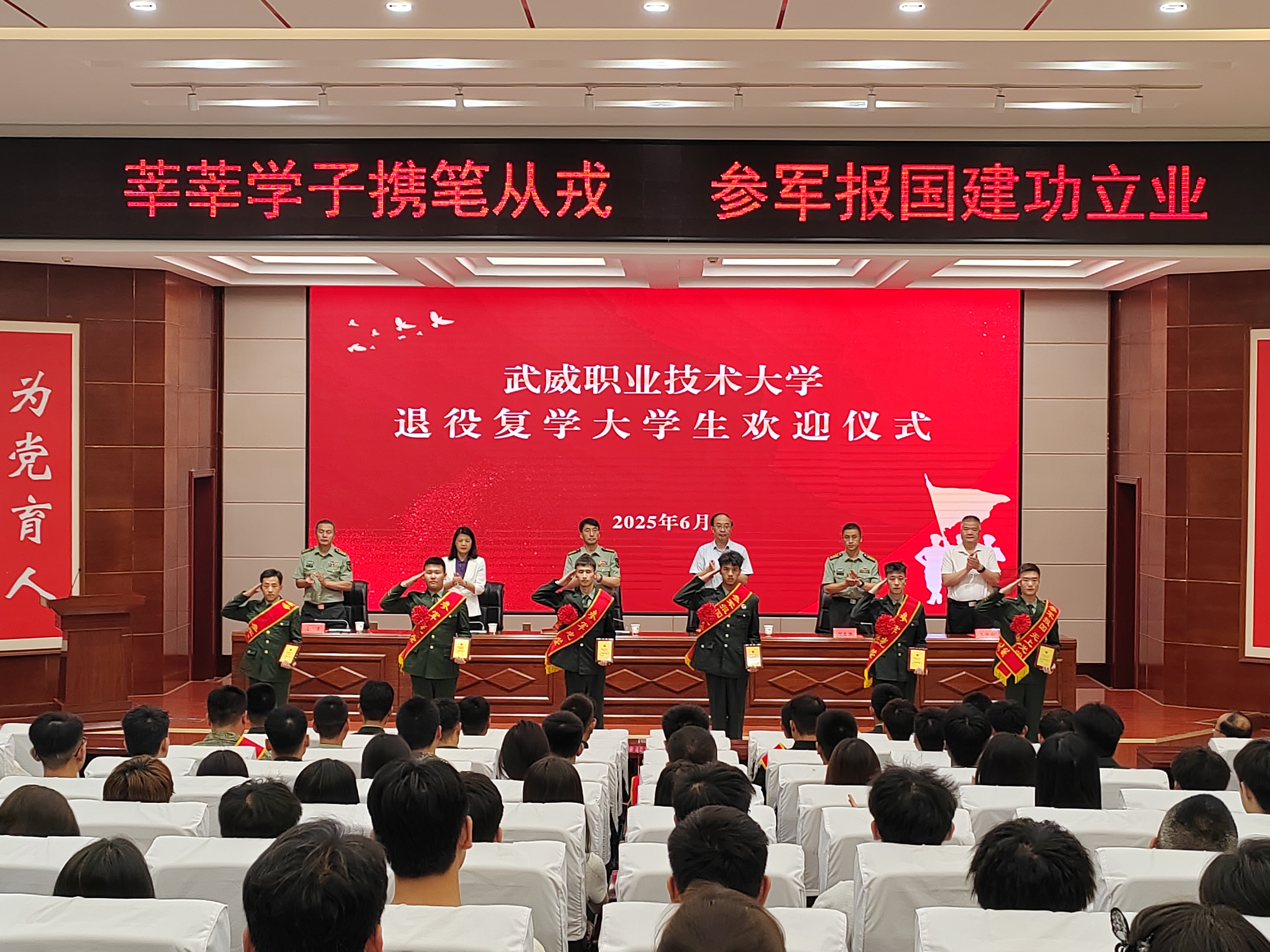 活動現(xiàn)場為2024—2025學(xué)年退役復(fù)學(xué)大學(xué)生舉行了歡迎儀式,并為他們頒發(fā)“退役復(fù)學(xué)軍人榮譽證牌”。退役復(fù)學(xué)大學(xué)生代表、醫(yī)學(xué)技術(shù)學(xué)院2024級針灸推拿大專(2)班周榮臻同學(xué)講述了軍旅生涯的磨煉和成長感悟,并號召青年大學(xué)生積極報名參軍;2025年應(yīng)征報名大學(xué)生代表、藥學(xué)院2024級藥學(xué)大專(1)班劉鑫同學(xué)宣讀了參軍入伍倡議書;駐武部隊優(yōu)秀大學(xué)生軍官代表符東洋少校分享了自己在部隊的成長經(jīng)歷。
