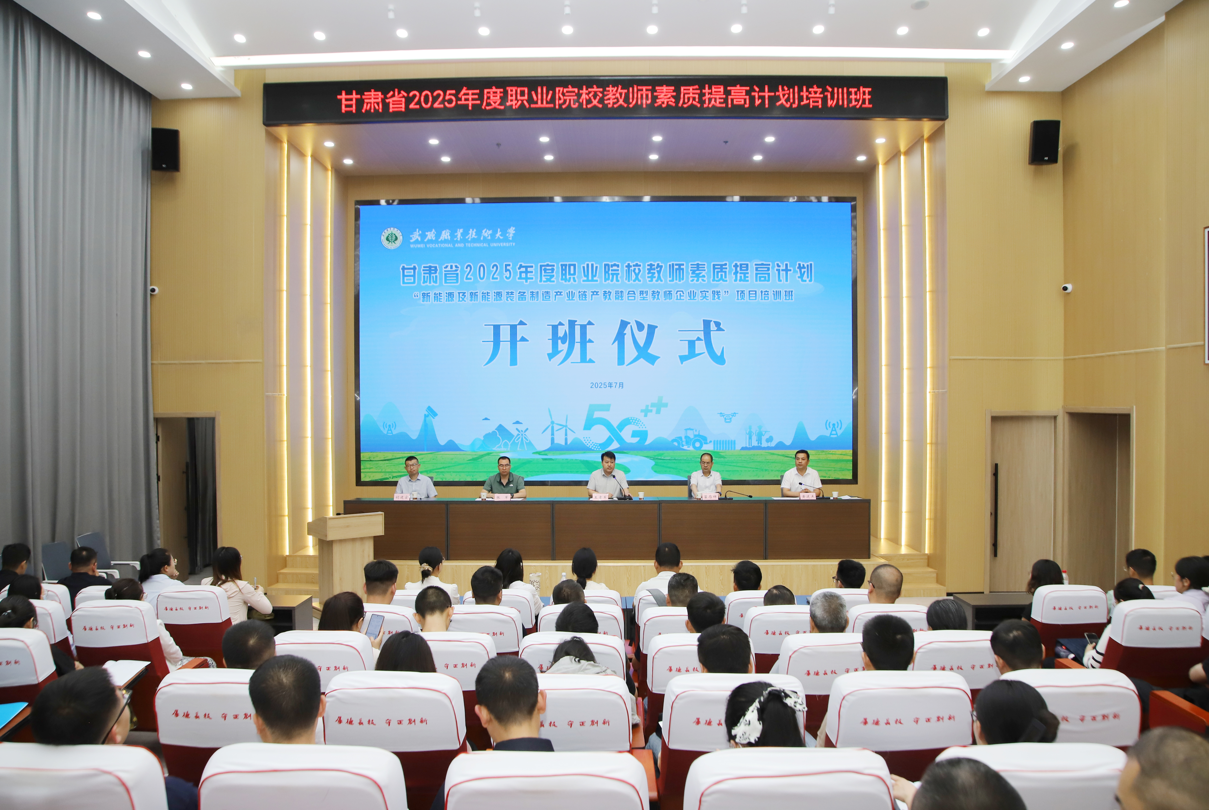 7月21日,由甘肅省教育廳主辦,武威職業(yè)技術(shù)大學(xué)首次承辦的甘肅省2025年度職業(yè)院校教師素質(zhì)提高計(jì)劃“新能源及新能源裝備制造產(chǎn)業(yè)鏈產(chǎn)教融合型教師企業(yè)實(shí)踐”項(xiàng)目培訓(xùn)班在學(xué)校順利開班,培訓(xùn)旨在提升教師產(chǎn)教融合、實(shí)踐教學(xué)、技術(shù)創(chuàng)新與服務(wù)的意識(shí)和能力,為甘肅省職業(yè)院校新時(shí)代高素質(zhì)專業(yè)化教師隊(duì)伍建設(shè)提供有力支撐。黨委副書記翟存祥,甘肅省職業(yè)院校教師素質(zhì)提高計(jì)劃管理辦公室負(fù)責(zé)人及專家出席開班儀式,來自全省16所職業(yè)技術(shù)大學(xué)(學(xué)院)的120名骨干教師參加培訓(xùn)。中科低碳新能源技術(shù)學(xué)院院長(zhǎng)黃述杰主持開班儀式。