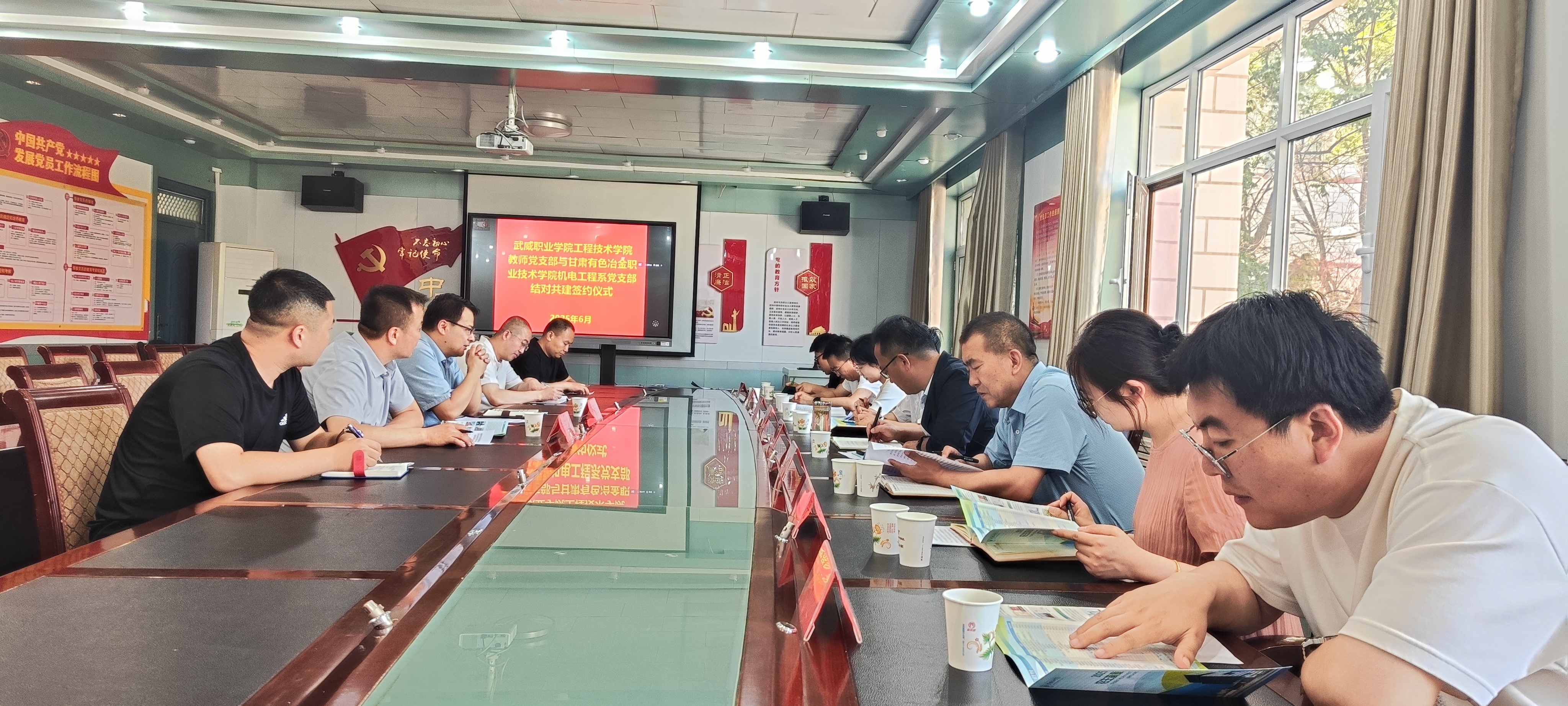 為進(jìn)一步加強(qiáng)黨組織建設(shè),提升黨員的政治素養(yǎng)和黨性修養(yǎng),6月11日,學(xué)校工程技術(shù)學(xué)院教師黨支部和甘肅有色冶金職業(yè)技術(shù)學(xué)院機(jī)電工程系黨支部結(jié)對共建簽約儀式在博學(xué)樓黨員活動(dòng)室舉行。甘肅有色冶金職業(yè)技術(shù)學(xué)院組織部部長高立兵、督導(dǎo)中心主任趙登峰、機(jī)電工程系黨支部書記侯婷婷,學(xué)校工程技術(shù)學(xué)院黨總支書記王鐸云、副院長徐生龍出席儀式,雙方黨員共計(jì)20人參加儀式。