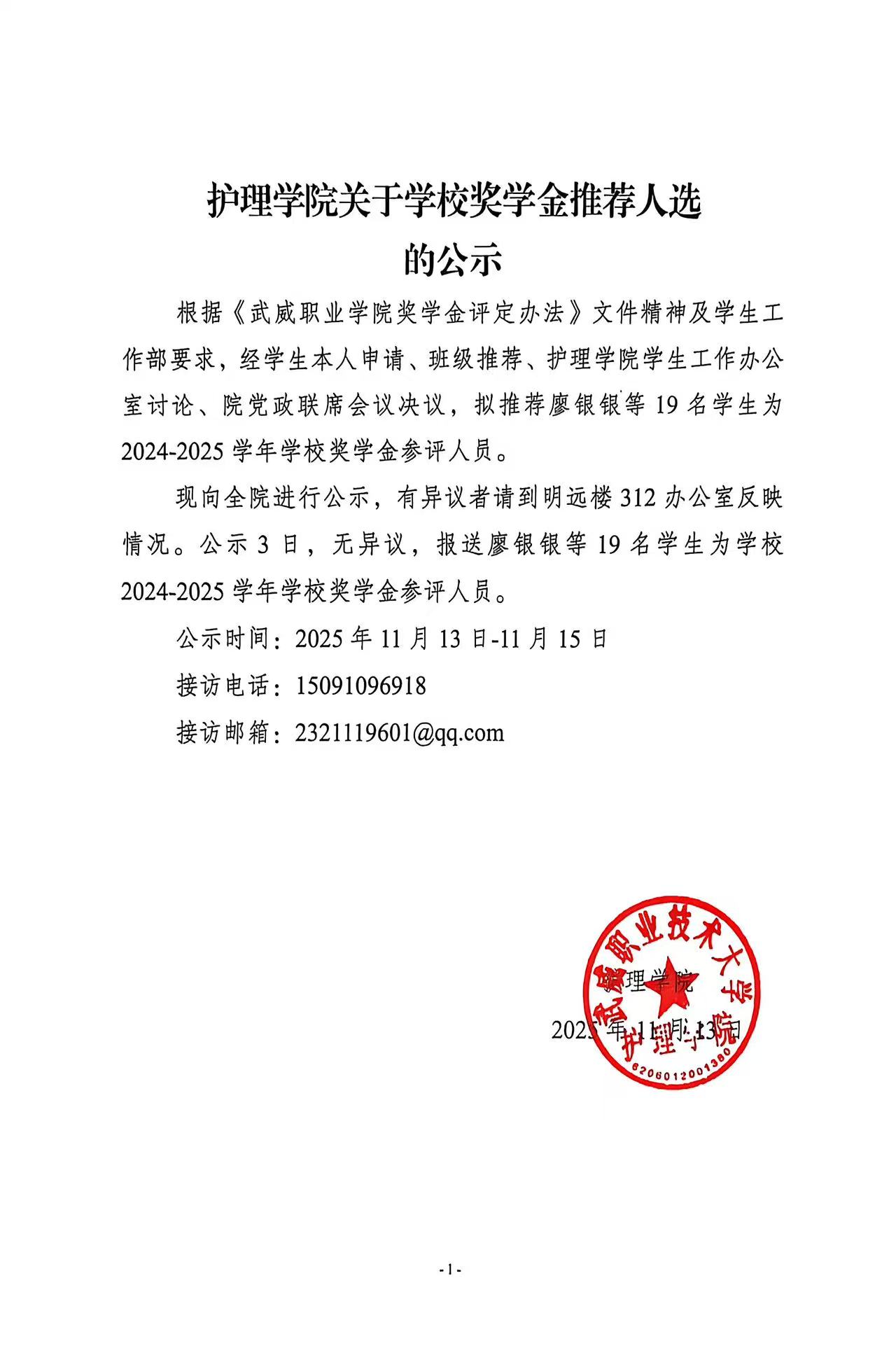 護理學院關于2025年國家助學金獲評人選的公示