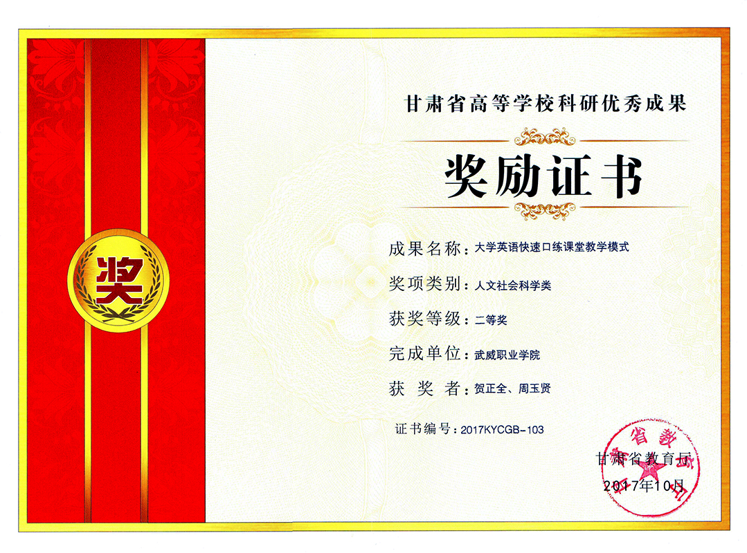 近日從學(xué)院科研處傳來喜訊,我系教師賀正全申報的《大學(xué)英語快速口練課堂教學(xué)模式》榮獲甘肅省教育廳頒發(fā)的2017年甘肅省高等學(xué)校科研優(yōu)秀成果二等獎。這是我院自建院以來獲得的最高級別的高??蒲袃?yōu)秀成果獎。本次獲得二等獎的科研成果共有154項,其中高職高專報送的科研成果只有9項獲得二等獎。